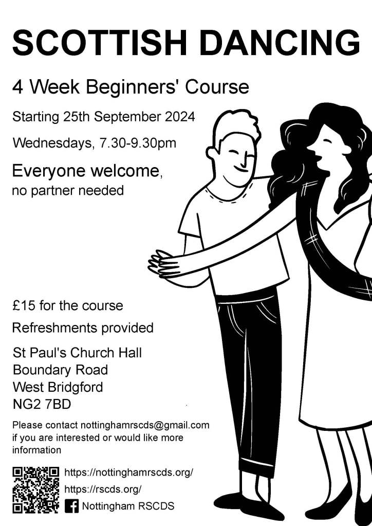 Nottingham RSCDS are pleased to be able to offer their Beginners’ Programme again during the Autumn Term 2024. The flyer for this programme can be seen above and more details can be found here: https://nottinghamrscds.org/beginners-programme/