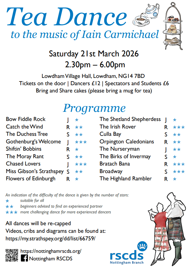 Tea Dance to the music of Iain Carmichael Posted on March 21, 2026March 25, 2026 by nottinghamrscds https://my.strathspey.org/dd/list/66759/ Share this: Share on X (Opens in new window) X Share on Facebook (Opens in new window) Facebook Like Loading... Related